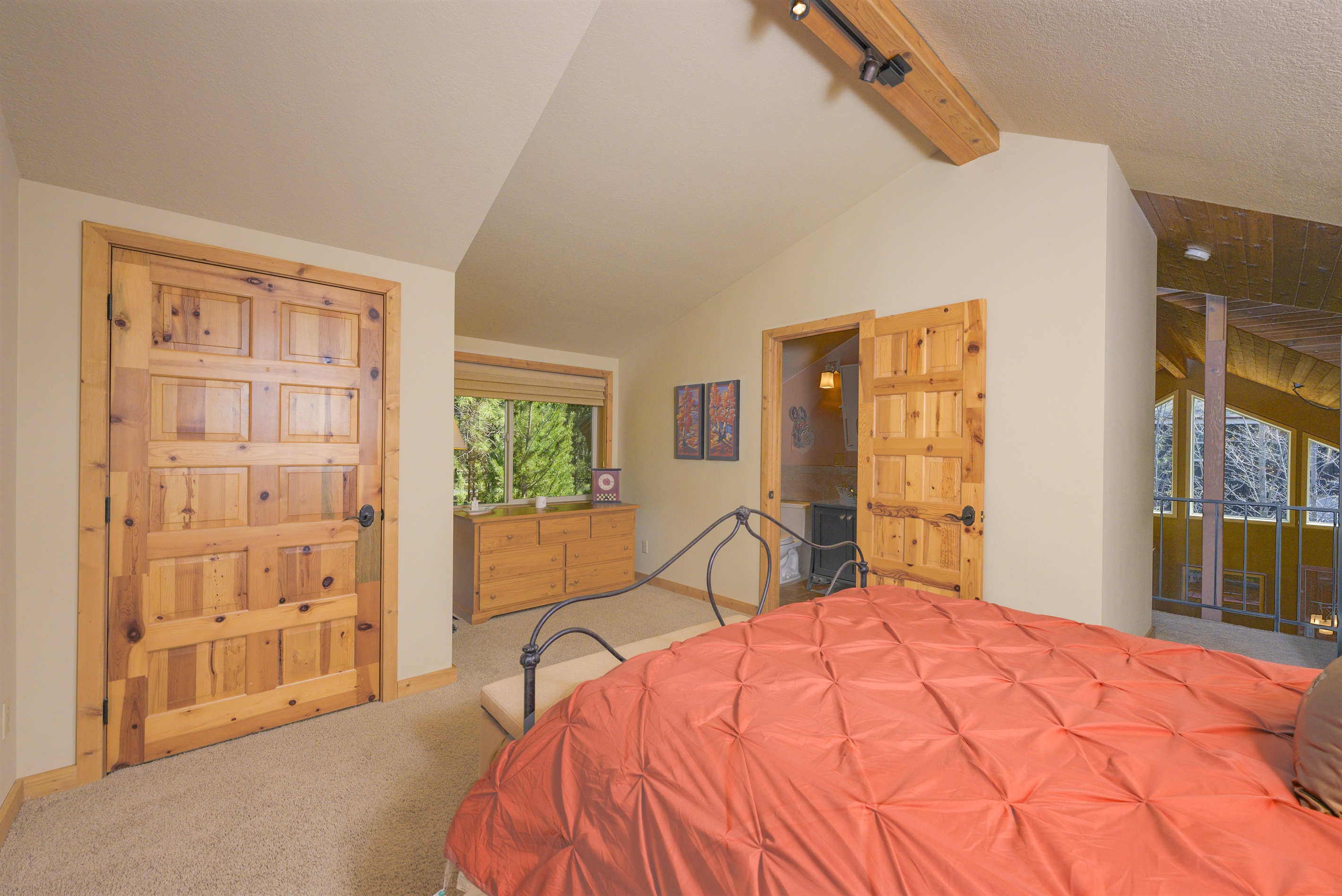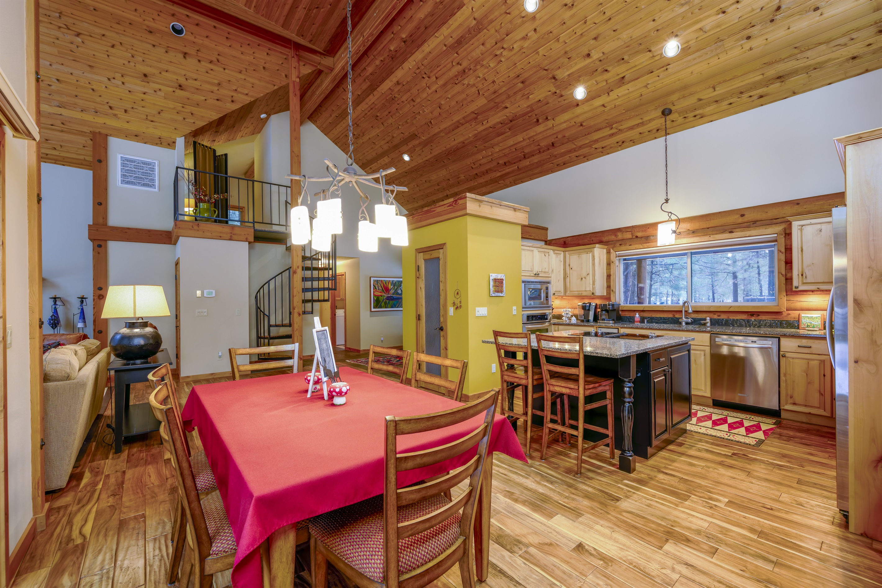 Step into the warm embrace of vaulted, open-beam wood ceilings and a wall of windows that frame stunning views of the surrounding ponderosa pines. The well-stocked kitchen makes family meals a breeze, while the open great room invites you to unwind by the gas fireplace. Downstairs, you’ll find a spacious bedroom with a king bed and sliding glass doors leading to the backyard and hot tub—perfect for morning coffee or an evening soak under the stars. There is a full bathroom on the main floor.